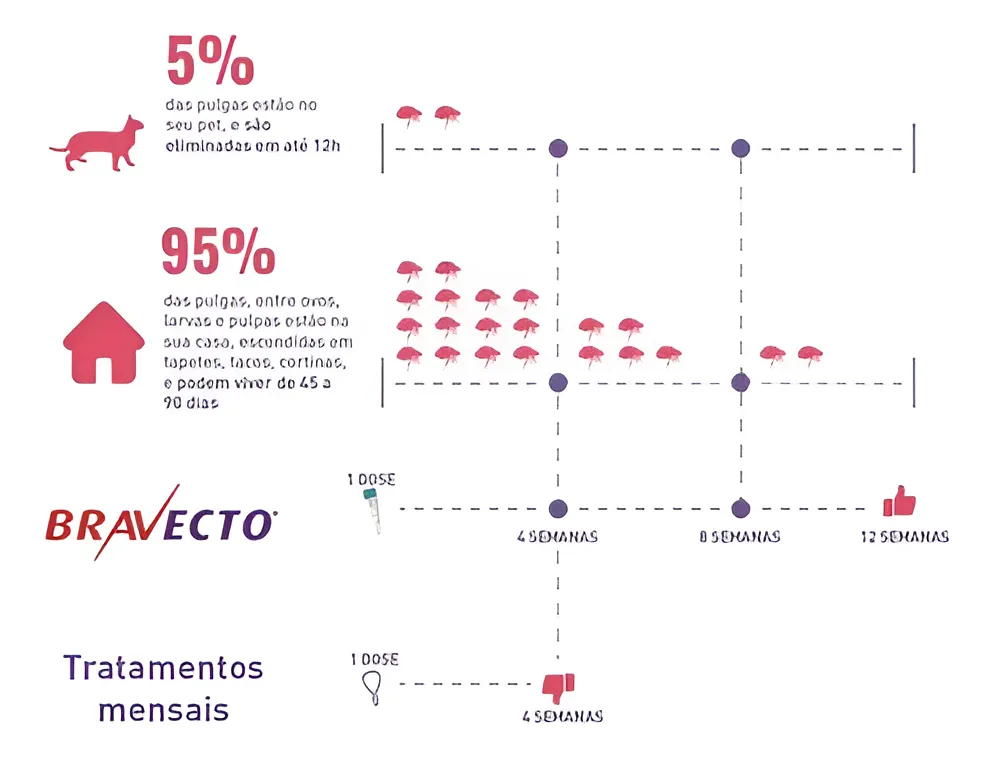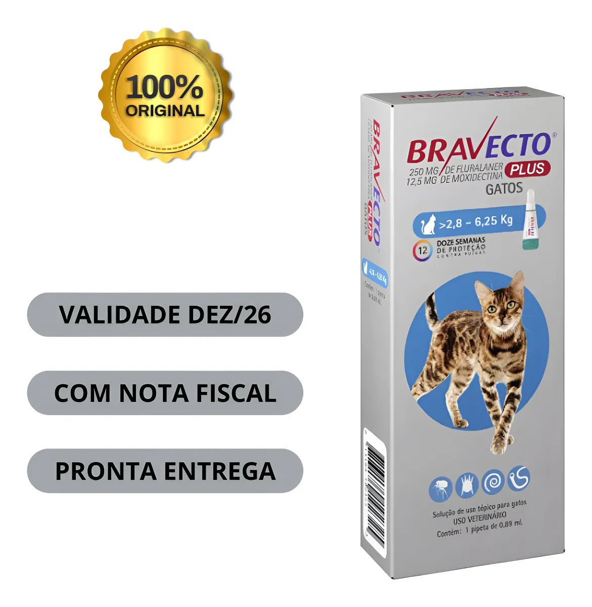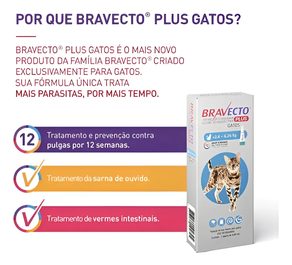 Antipulgas e Carrapatos Bravecto Plus Gatos 2,8 a 6,25kg – Indicado para gatos; – Capaz de proteger por 12 semanas com uma única dose; – Eficaz no tratamento de Sarna otodécica e vermes; – Ação rápida e eficácia persistente; – Mata 100% das pulgas dentro de 12 horas da aplicação – Indicado para gatos a partir de 9 semanas de idade; – Para gatos de 2,8 a 6,25kg; – Tecnologia Inovadora Fluralane. Bravecto Plus Gatos: Antipulgas no formato de pipetas Para você cuidar cada vez melhor do seu gato é fundamental protege-lo contra pulgas, pois esses parasitas podem prejudicar a sua saúde e a dele. Os gatos podem ser infestados por pulgas de diversas maneiras. Ao entrarem em contato com animais infestados, durante passeios e até por meio da roupa de pessoas que tiveram contato com pulgas. Pensando nisso a MSD criou a linha de antipulgas Bravecto Plus que garante ainda mais proteção para o seu felino. Bravecto Plus Gatos: A família Bravecto aumentou para proteger até quem tem 7 vidas. Bravecto Plus Gatos é um produto para gatos com ou em risco de infestações parasitárias mistas por pulgas e nematódeos gastrointestinais (vermes de Toxocara cati, Toxascaris sp, e Ancylostoma tubaeforme) e ácaros de orelha (Otodectes cynotis). BRAVECTO PLUS GATOS é indicado quando o uso contra pulgas e um ou mais dos outros parasitas-alvo são indicados ao mesmo tempo. A segurança foi demonstrada em gatos com 9 a 13 semanas de idade e pesando entre 0,9 a 1,9 Kg, em overdoses de até 5 vezes a dose máxima recomendada por três tratamentos com intervalos menores (8 semanas) que o recomendado. O tratamento reduz o risco de transmissão de doenças causadas por pulgas devido ao rápido início da ação inseticida. Os parasitos precisam iniciar a alimentação no gato para serem expostos ao fluralaner, portanto o risco de transmissão de doenças causadas por pulgas não pode ser excluído em condições desfavoráveis. Bravecto Plus Gatos: Ação contra carrapatos e pulgas Para gatos com ou em risco de infestações parasitárias mistas por pulgas e nematódeos gastrointestinais (vermes de Toxocara cati, Toxascaris sp, e Ancylostoma tubaeforme) e ácaros de orelha (Otodectes cynotis). BRAVECTO PLUS GATOS é indicado quando o uso contra pulgas e um ou mais dos outros parasitas-alvo são indicados ao mesmo tempo. No tratamento de infestações por pulgas (Ctenocephalides felis) em gatos, proporciona atividade de eliminação persistente por 12 semanas, que devem começar a se alimentar no hospedeiro para serem expostas aos princípios ativos, portanto o risco de transmissão de doenças causadas por pulgas não pode ser excluído. O produto pode ser utilizado como parte de uma estratégia de tratamento para a dermatite alérgica à picada de pulgas (DAAP). Como Utilizar o Bravecto Plus Gatos É preciso utilizá-lo com atenção, ele é muito simples, mas deve ser aplicado com carinho. Evite desperdícios, destrave a tampa do tubo com a ponta deve ser inclinada para cima; Assim que ocorrer a quebra da vedação ele está pronto para ser utilizado; Aplique o produto nas costas do gato; O produto deve ser aplicado na nuca do gato a cada 12 semanas, não tirar a tampa, basta girar; Evite aplicar uma quantidade excessiva da solução; Evite banho e aguarde o resultado, eles acontecem a partir de oito horas após a aplicação. Composição FLURALANER/MOXIDECTINA Cartuchos contendo uma pipeta com 0,4 mL equivalentes à 112,5mg de fluralaner e 5,6mg de moxidectina D10695229 Garantia do vendedor: 3 meses