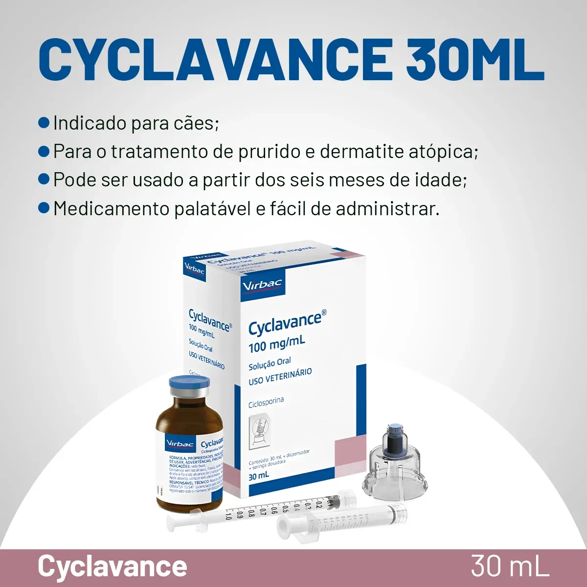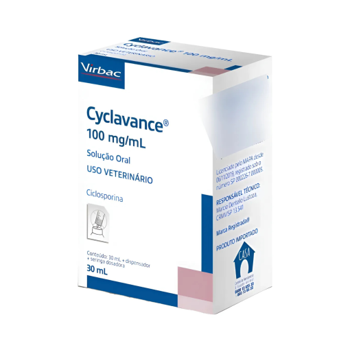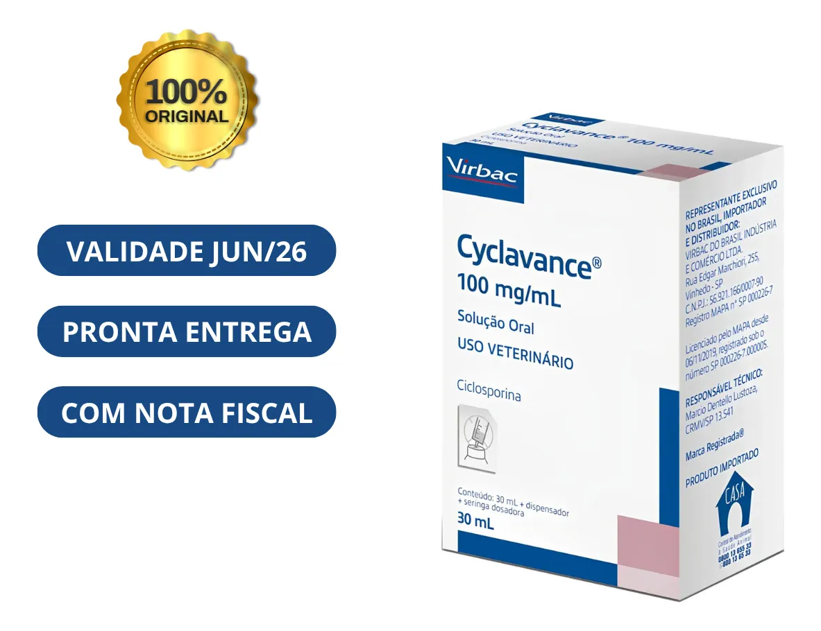 CYCLAVANCE 30ML CACHORROS Ciclosporina em solução oral para o controle das manifestações clínicas de dermatite atópica em cães. FÓRMULA: Ciclosporina …………………………………………………. 100,0 mg. Veículo q.s.p. …………………………………………………… 1,0 mL. INDICAÇÕES: CYCLAVANCE® é indicado para tratamento e controle do prurido, eritema e outras manifestações clínicas decorrentes da dermatite atópica em cães. PROPRIEDADES: A ciclosporina é uma substância imunossupressora seletiva, que atua especificamente e reversivelmente sobre os linfócitos T, a interleucina-2 e outras citocinas, promovendo efeitos anti-inflamatórios e antipruréticos. Outras propriedades são a capacidade de inibir a função de apresentação dos antígenos do sistema imune da pele, bloqueando o recrutamento e ativação dos eosinófilos, a produção de citocinas pelos queratinócitos, a função das células de Langerhans, a degranulação dos mastócitos e desta forma a liberação de histamina e citocinas pró-inflamação. A ciclosporina administrada por via oral sofre absorção no epitélio do intestino delgado. A concentração máxima (C-max) é atingida aproximadamente 2 horas após a administração oral, na dose de 5 mg/kg (espécie canina) com níveis plasmáticos de 600 a 1200 ng/mL, sendo a biodisponibilidade da molécula de aproximadamente 23% a 45%. A meia-vida média é de aproximadamente 7 a 10 horas em cães, enquanto a eliminação ocorre principalmente via hepática. POSOLOGIA: USO ORAL. Administrar a dose de 0,05 mL de CYCLAVANCE® por kg de peso do animal (essa dose corresponde a 5 mg/kg de ciclosporina), a cada 24 horas. Recomenda-se a administração do produto duas horas antes ou duas horas após a alimentação. O peso do animal deve ser cuidadosamente aferido antes e durante o tratamento. VANTAGENS: Segurança Ciclosporina é usada há anos em medicina veterinária; Mais seguro do que corticoides, pois possui menos efeitos colaterais. Eficácia Cyclavance® é ciclosporina em microemulsão; Alta biodisponibilidade quando comparada com formulações à base de óleo vegetal. Precisão Embalagem moderna e prática; Medicamento palatável e fácil de administrar. Economia Cyclavance® está indicado na fase crônica de controle dos sinais clínicos de Dermatite Atópica. Acompanhe o cálculo de rendimento do frasco (em dias) por peso do animal: Garantia do vendedor: 3 meses