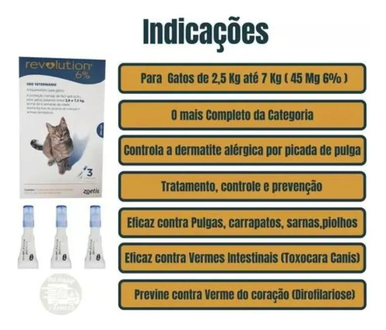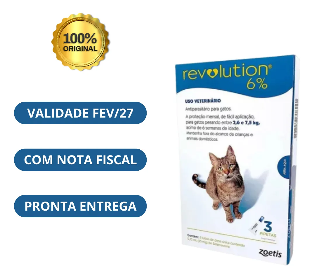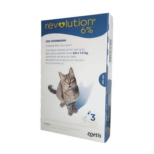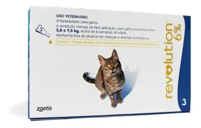 Antipulgas e Carrapatos Revolution 6% para Gatos de 2,5 a 7,5 kg – 3 pipetas é composto, uma solução pronta para uso para o tratamento tópico de gatos. Indicado para quebra do ciclo das pulgas na primeira aplicação, inibe o desenvolvimento das larvas de pulgas do ambiente devido a sua ação residual, é eficaz no tratamento, prevenção e controle contra pulgas, auxilia o controle de carrapatos, trata e controla sarna de ouvidos e sarna vermelha, vermes intestinais e piolhos sugadores e mordedores, auxilia na desinfestação do ambiente e possibilita que o animal se molhe ou tome banho após duas horas da aplicação. Especificações: Indicação: Gatos Idade: Adultos, Idosos Tipo: Farmacêuticos Modo de Usar: Pressione firmemente a tampa para perfurar o lacre no tubo de Revolution 6% e então remova a tampa para administrar o produto diretamente na pele do animal sem massagear o local de aplicação. Afaste os pelos das costas do bichinho na região do pescoço, à frente dos ombros até que a pele seja visível e esprema o tubo firmemente para eliminar todo o conteúdo em um único ponto. O produto deve ser aplicado de acordo com o peso do animal, conforme informação abaixo: Animal/peso – Dose de Tratamento Gatos entre 2,5 e 7,5 kg – 0,75 ml Garantia do vendedor: 3 meses