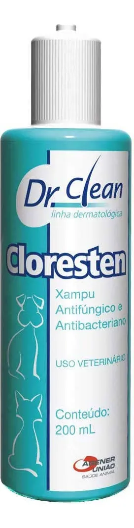 O Shampoo Agener União Dr. Clean Cloresten Antifúngico e Antibacteriano à base de clorexidina e miconazol é indicado para cães, gatos e equinos no tratamento e controle das infecções causadas por fungos e bactérias. Cloresten reúne em sua formulação clorexidina e miconazol, possibilitando um amplo espectro de ação contra as infecções bacterianas e fúngicas dos cães e gatos.
